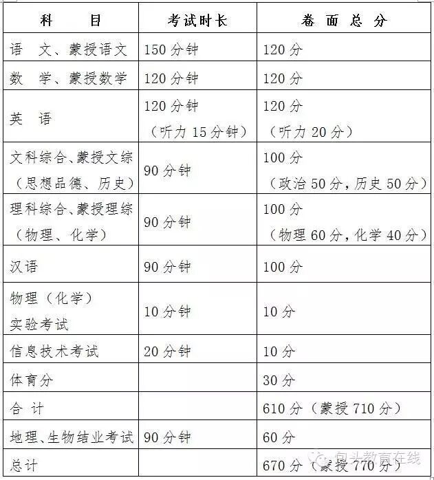 初中毕业生学业考试科目为语文、数学、英语、文科综合(思想品德、历史)、理科综合(物理、化学)共5卷7科,以及物理(化学)实验操作技能、信息技术、体育。蒙授考生加试汉语。考查科目为音乐、美术。八年级考试科目为地理、生物,两科一张试卷。
