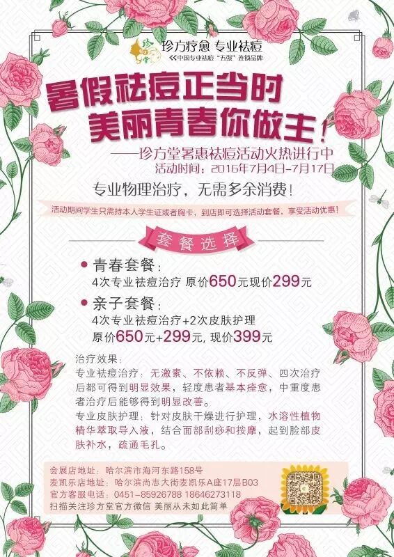 所以趁着还没有还在学校没有毕业进入社会,趁着年轻战痘的时间还短,趁着没到满脸痤疮痘痕,抓紧进行科学治疗吧,不要对未来丧失信心,相信哈尔滨珍方堂,还您光洁容颜,暑期特惠活动火热进行中,特惠套餐想您所想!