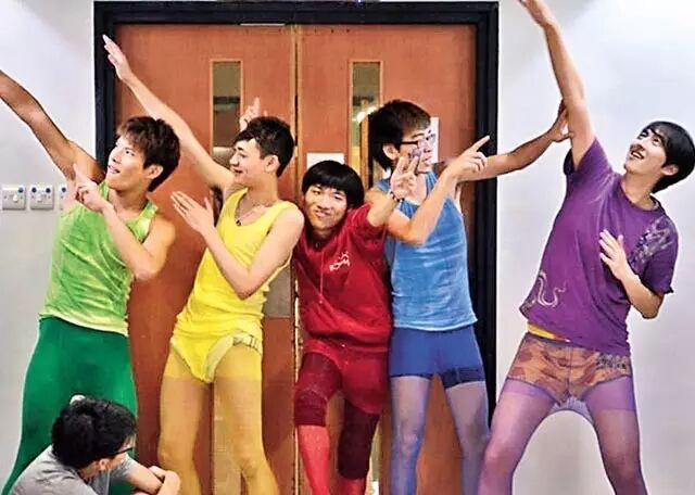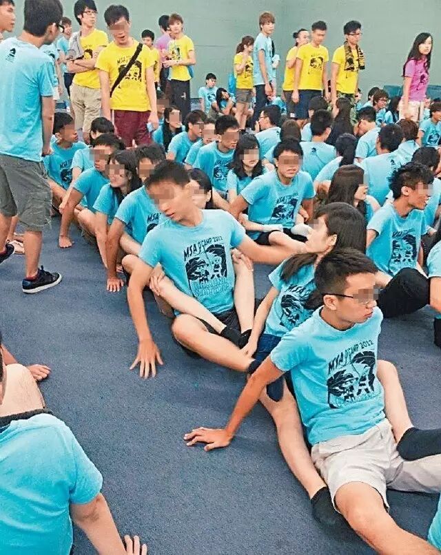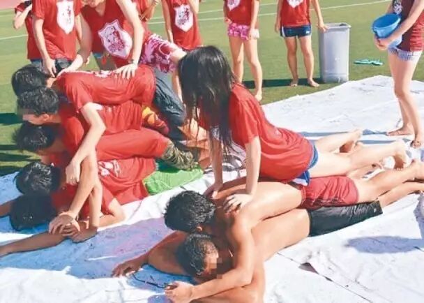 图为科大迎新营画面,男女生以脚夹着前方同学,易碰触敏感部位。