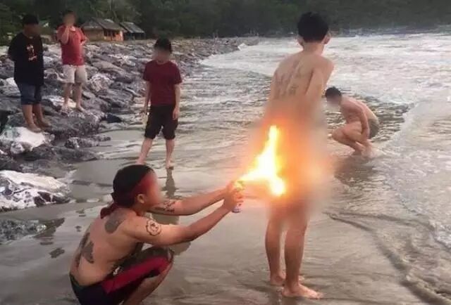 图为泰国一高校迎新活动上,学长用火喷学弟的皮屁股。