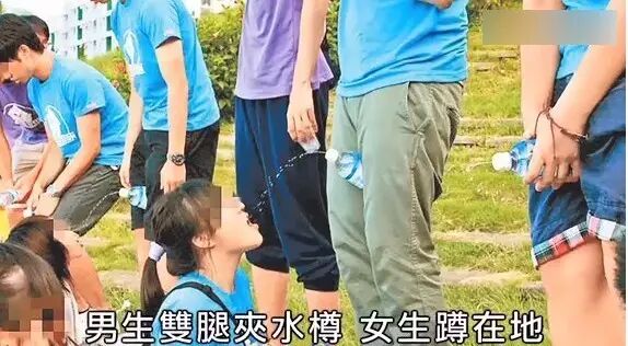图为科大曾经举办的迎新营活动,男生双腿夹着一水瓶,女生蹲在地上喝水。