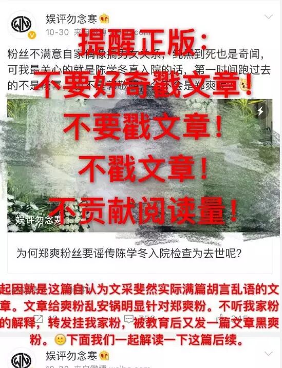 于是我就写了一篇文章,标题名为《为何郑爽粉丝要谣传陈学冬入院检查为去世呢?》,所写的内容完全没有敌意,只是简简单单陈述了一下事实,以及假设了一下郑爽粉丝真要去黑陈学冬的目的究竟是什么,显然我只是假设,而所假设的内容都来自于事实所呈现出来的现象,不管是真粉也好,还是黑粉也罢,总会有偏激和宠溺。