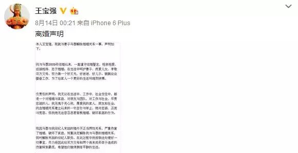 8月14日,王宝强在微博发布离婚声明,震惊整个娱乐圈。