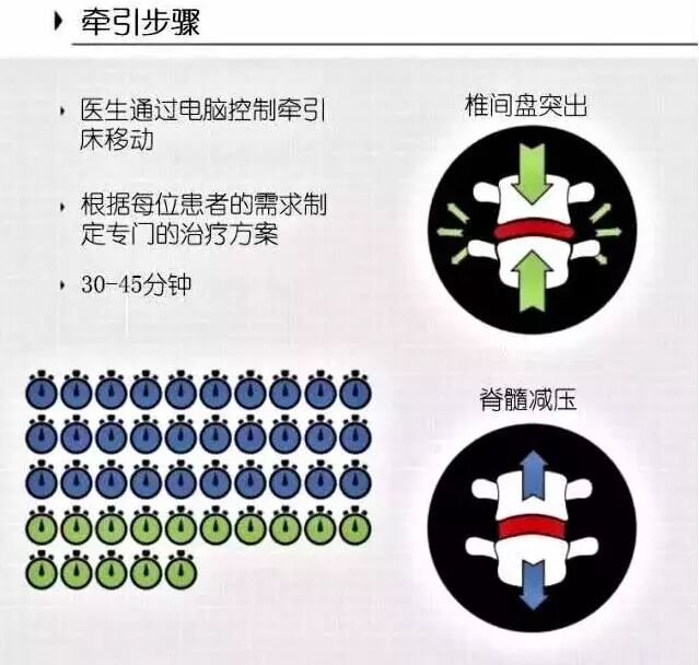牵引利用牵引设备的牵拉力与反牵拉力作用于腰椎或者颈椎,用来缓解椎间盘病发部位的疼痛。临床上,牵引可以用来缓解腰间盘突出给患者带来的酸、痛、麻、胀、僵等症状,所利用的原理就是拉大椎间盘的间隙,能够在一定程度上解除突出物对神经根的挤压,减少了神经根水肿的部分,从而让腰突患者的腰椎得到暂时的休息。