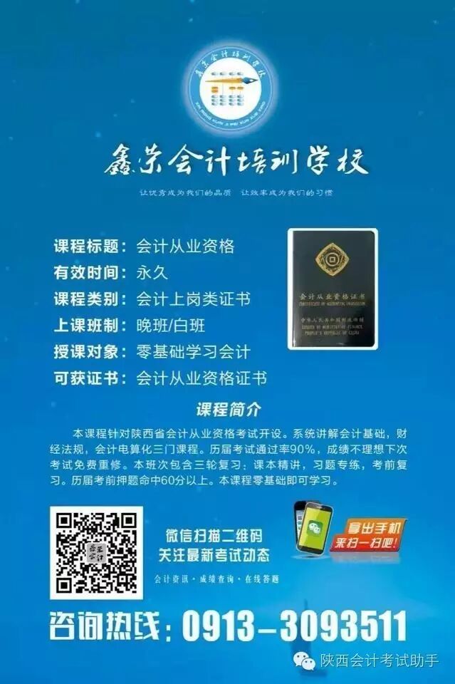 陕西省会计从业资格证考试每年组织两次,四月份一次,十月份一次。鑫荣会计针对2017年四月份考试,开设了周内晚班、周末白班。目前周内一班、周末二班已经开课了。周内二班于12月18日正式开始上课。参加2017年4月从业考试的学员抓紧时间报名了。