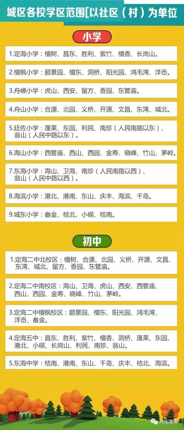 2017年秋季小学招生对象为2011年8月31日之前出生的适龄儿童;初中招生对象为小学毕业的适龄儿童少年。定海城区入学对象必须实际居住在定海城区,具体分为以下五类:
