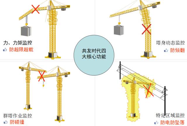 1、使用共友时代塔式起重机安全监控管理装置它可以不间断的采集塔机的角度、幅度、高度、起重量、行走位置、风速等信息,另有故障自行诊断功能,如果塔机各限位存在故障,可及时诊断并提示有关人员、全天候运行,实时监控塔机运行状态,,避免了以往因靠视觉直观存在片面和主观判断失误而不能及时发现和制止危险作业的情况发生。,有效的预防违章操作、违章超载、斜拉斜吊等操作行为加大监督管理力度,消除事故隐患的需要。