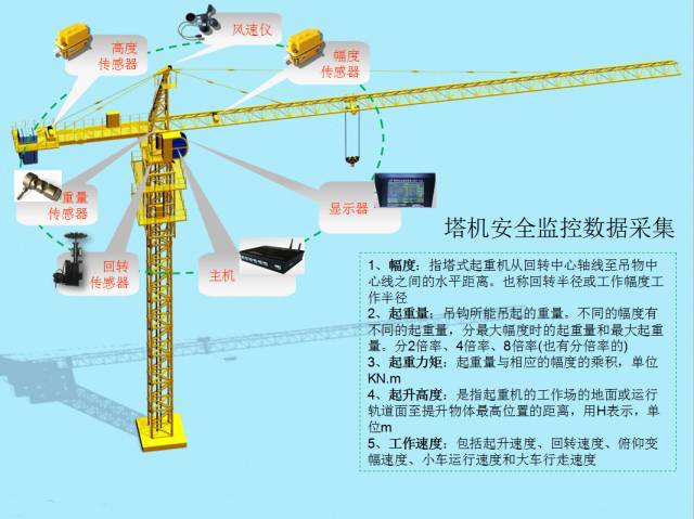 6、使用共友时代塔式起重机安全监控管理装置,是培养队伍、提高从业人员素质、提高监督管理技术水平的需要。通过处罚司机操作过程中打反车、急停急吊、率。特别是当塔吊司机观察不到所吊重物时,若指挥人员不限制工人装配的货物状态(重量、位置),起吊时司机可通过监控仪获知所吊重物是否超载或斜拉,及时采取措施纠正。