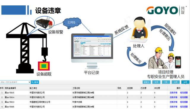 5、安装共友时代塔式起重机安全监控管理装置,有效记录塔机运行情况以及对安全隐患、违章操作、运行风险等进行查询统计,帮助管理人员确保所有塔机安全运行;远程监控平台部门或者公司管理部门对其所辖工程所有塔机运行和安全情况提供实时监控和数据分析、查询统计等功能,便于及时发现和制止非安全行为,避免隐患事故的恶化。