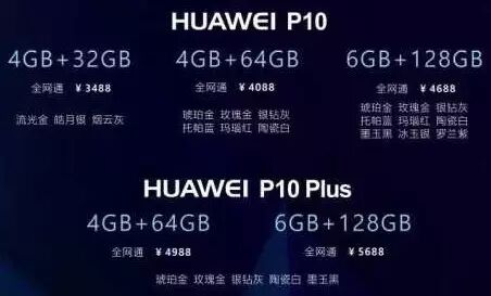 结合之前网上曝光信息显示,华为 P10 提供 4GB+32GB / 4GB+64GB / 6GB+128GB 三种容量版本,售价分别为 3488 元、4088 元、4688 元。
