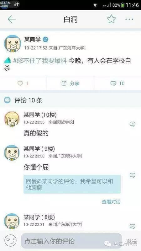 位于湛江的广东海洋大学湖光校区一名大二男生今日上午被发现死在校园草丛中,有消息称,出事的学生最近情绪有些异常。不知道是不是出于巧合,该学生失踪前,该校有学生在网上发帖称会有学生。