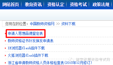 申请人登录C(www.jszg.edu.cn),点击“资料下载”,第一个即是“申请人思想品德鉴定表”或者各个市、区公告附件下载。
