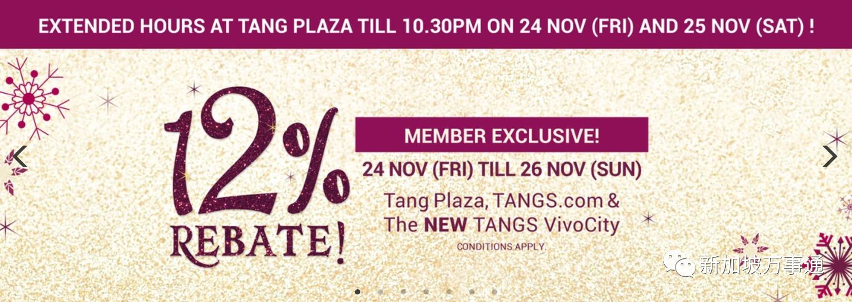 Tangs黑五折扣来袭,服饰、孩童用品种类高达20%折扣;家庭电器类高达10%折扣;美妆类,每花300元,获一份30元礼券。
