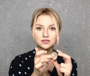 将散粉盒盖紧,倒过来,用手指轻轻敲一下散粉盒底部,让散粉掉在盖子上一些。打开盖子,使用长绒毛粉扑沾取盖子上的一些散粉(记得抖一抖),用点压的方式轻轻压过全脸。
