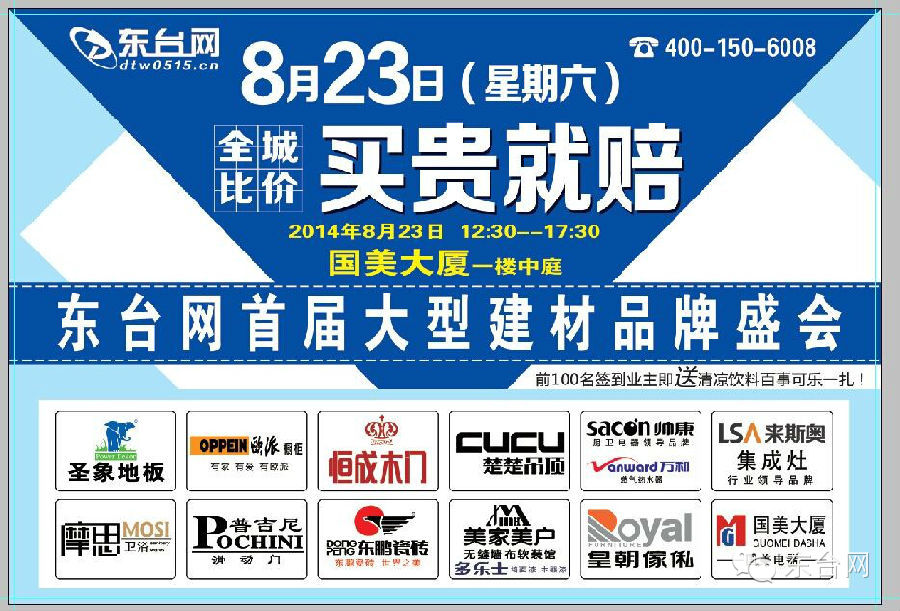 2014年8月23日中午12:30,由东台网举办的东台首届全城比价,买贵就赔大型建材家具品牌盛会将在国美大厦一楼中庭隆重举行。