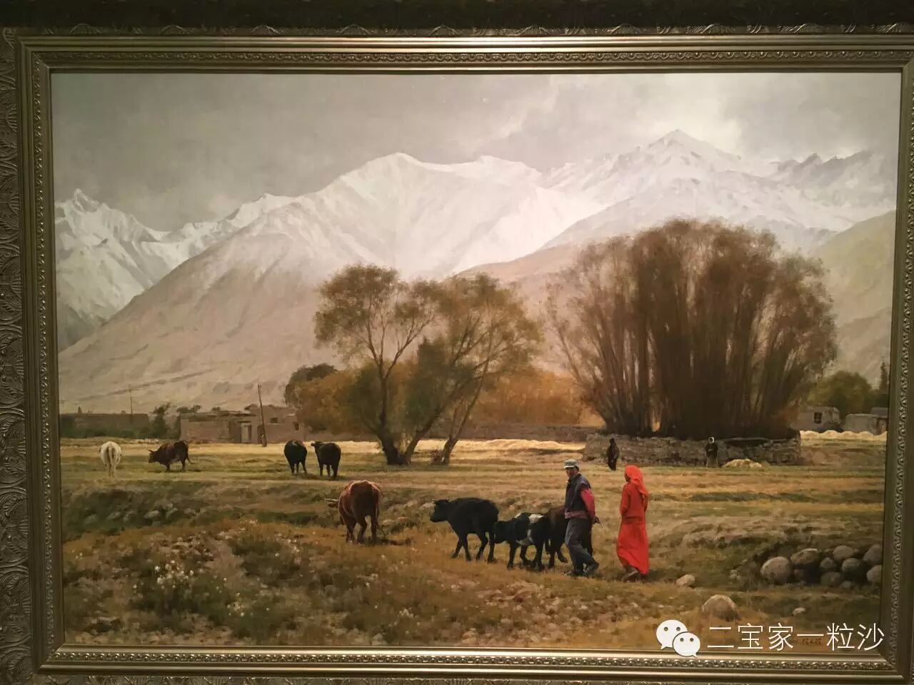 我最喜欢一幅名为《雪山脚下的村庄》的风景画,第一次有了走到跟前不想离开的感觉。至于皮皮,我本没指望他能看得懂多少,又正值饭点,吃了很多零食依然喊饿,我就让他坐在展厅中间的椅子上等着我,不喜欢看了可以不看,但不能影响妈妈看。