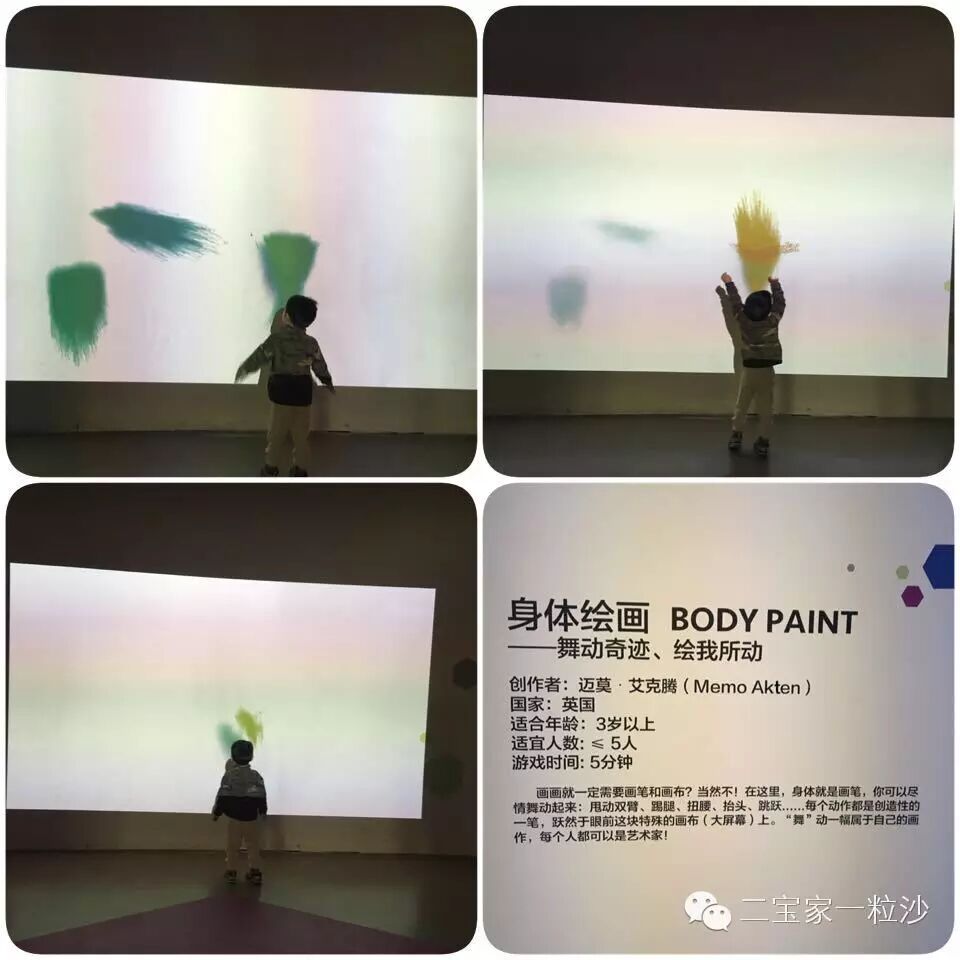 “奔向未来”这个展览来自加拿大多伦多国际电影节,由13组以学习为中心的互动装置组成,包括游戏、移动应用软件和实际动手制作活动,是该展览在中国、在亚洲的首次展出(网上抄的)。13组,话说其实不多,一眼就望到底,但玩下来确实觉得这个规模还是合适的,孩子都可以去体验,而不是走马观花,遇到特别喜欢的,想必某一个游戏还能玩个把小时呢。皮皮最喜欢玩的是“身体绘画”,就是舞动身体,就可以在特殊的画布(屏幕)上挥洒出各种颜色,皮皮跳到浑身湿透…还有个机器人制作(具体项目名称忘记了)也很吸引他,其他的项目基本没怎么玩,有的我感兴趣的他反而害怕。