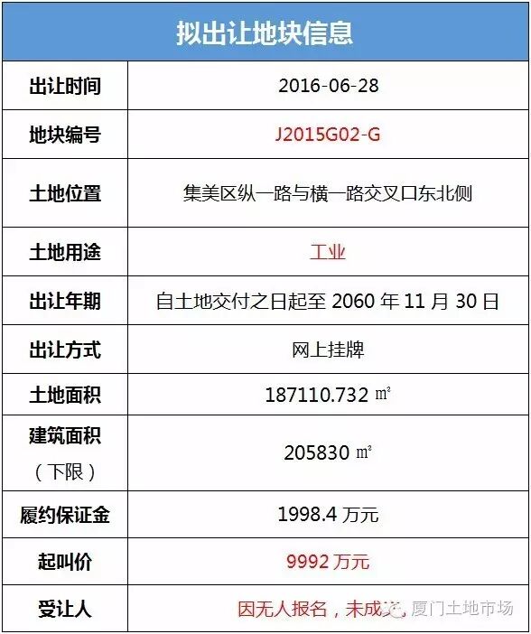 2016年6月28日,于厦门市土地矿产资源交易市场网上挂牌交易的集美区J2015G02-G工业地块成交结果出炉:
