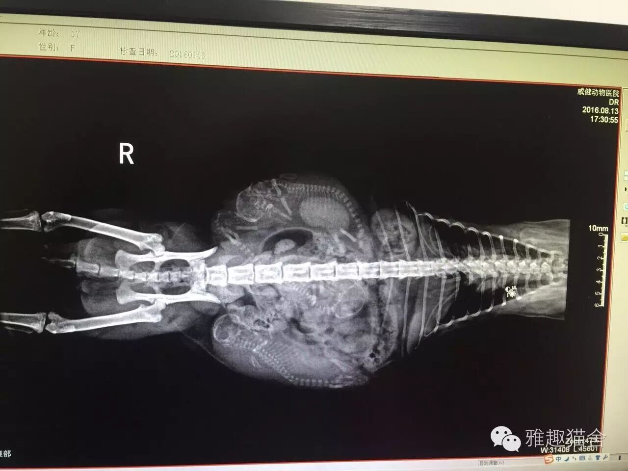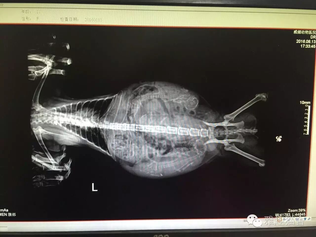 3)最保险的产检方法(同时也是检查费最贵的):母猫怀孕60天照X光跟B超同时进行。X光是要照正位和侧位。通过数头骨和脊椎的数量看出怀有多少只小猫,同时量出猫头骨大小是否小于盘骨大小,如果头骨比盘骨小,一般生产不会太大问题,如果头骨明显大于盘骨,母猫一般很难正常生产,这时要考虑剖腹,还有就是看清胎位是否正确,因为胎位不正也是导致母猫难产的一个重要因素。