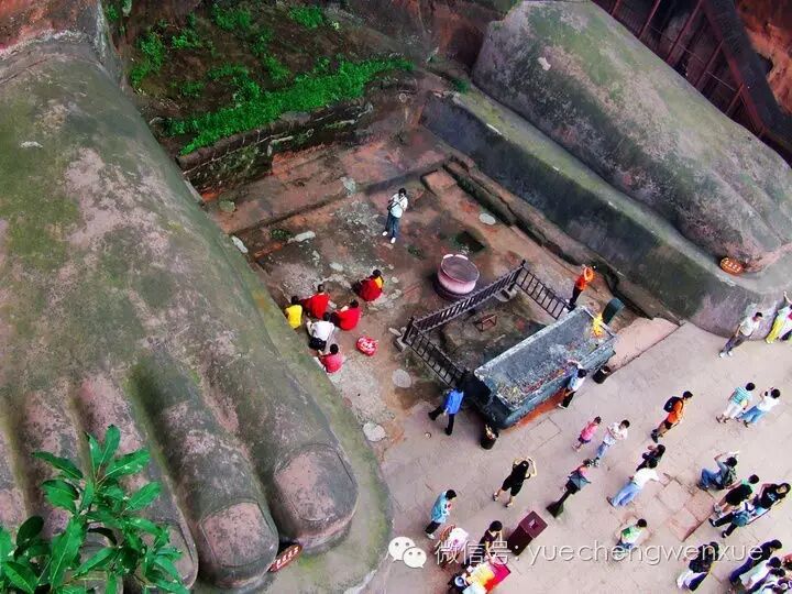 一个多小时后,我们达到大佛脚底。这儿有不大的一片空地。既可仰视大佛全身,也可远望江面上的游船。大佛的脚板可站几十个成人,据说以前是可以上去的,现在已被围栏防护起来。