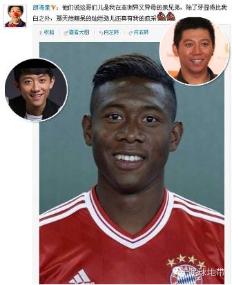 再说个有名的:奥地利刘星——阿拉巴。著名歌手羽泉(胡海泉)也在微博凑热闹,认了非洲球星当兄弟。