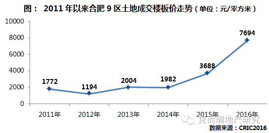 过往几年房企囤地土地增值收益相当可观。从2011年以来9区土地成交楼板价来看,5年间涨了接近7倍,2016年平均楼板价已经达到7700元/平方米,虽然相比其他热门二线城市来看,仍有不少差距,但如此之快的涨幅足以让房企赚的盆满钵满,尤其目前合肥土地市场火热异常,土地仍有升值空间。