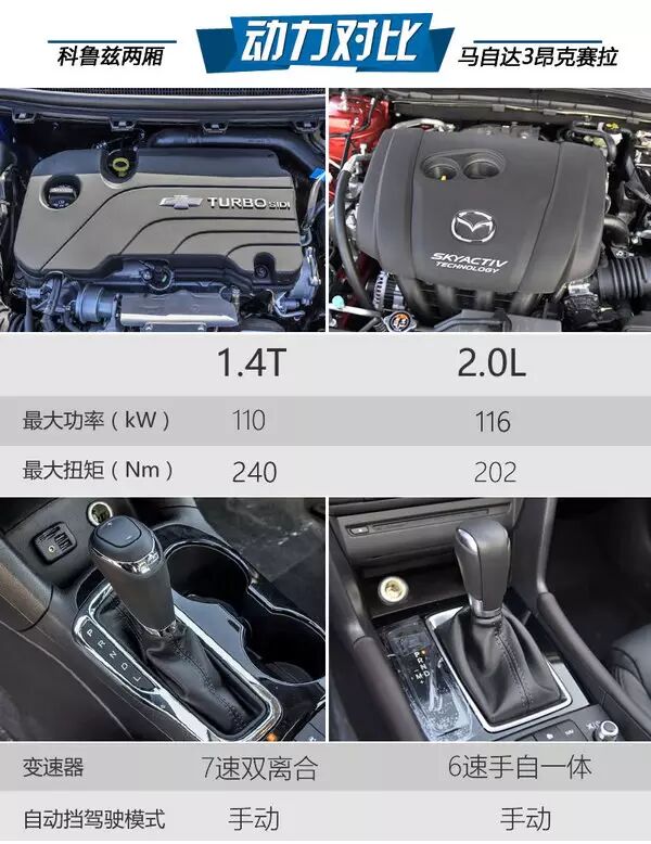两车动力方面有较大的差异,科鲁兹采用了当下流行的小排量增压发动机,低速爆发力强,燃油经济性较高;而马自达3昂克赛拉则搭载了马自达引以为傲的创驰蓝天技术2.0L发动机,具有更为强大的功率,配合6速手自一体变速箱动力输出线性流畅,同时多连杆独立后悬挂也让其在硬件上就比科鲁兹的操控性能更优异。