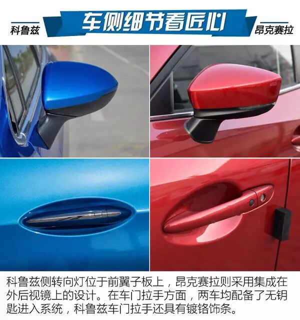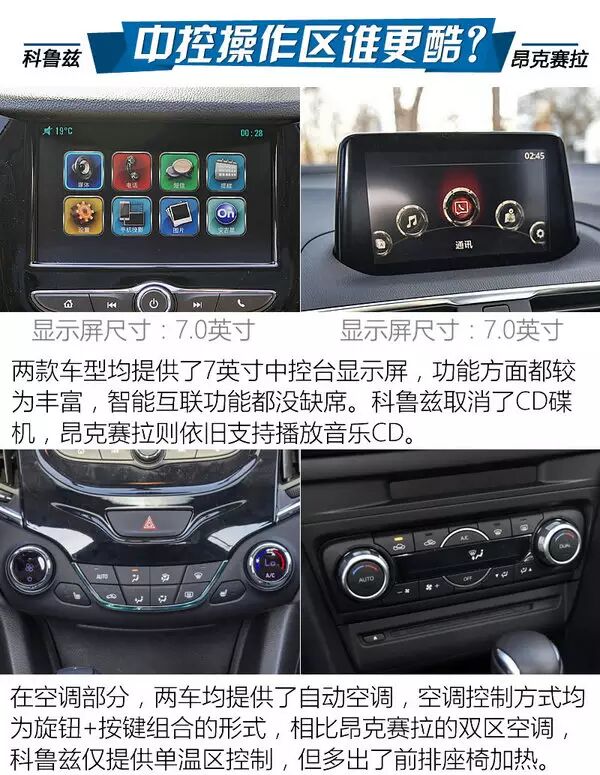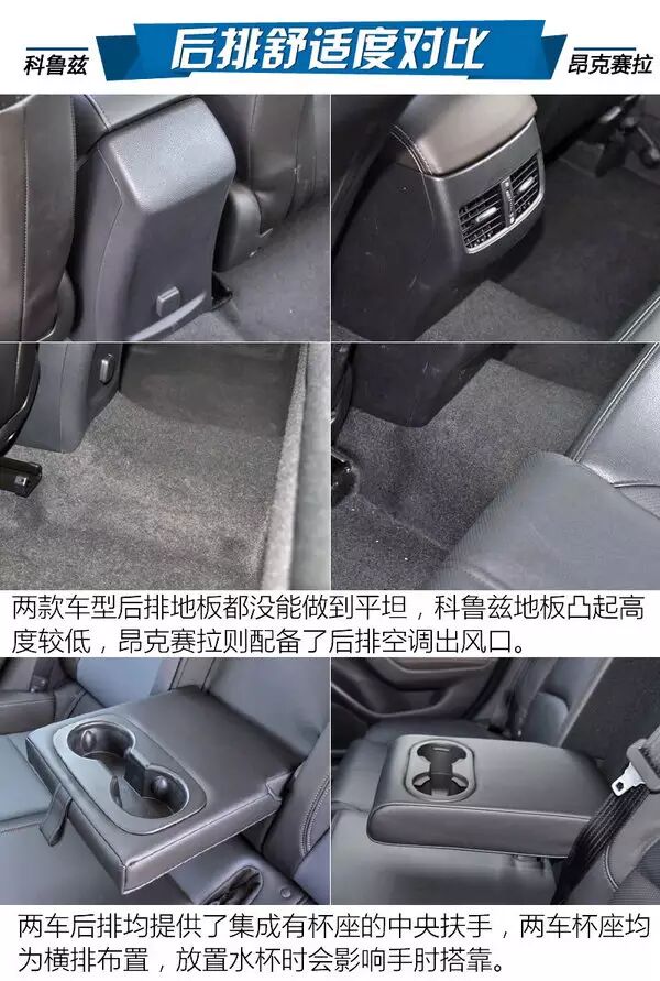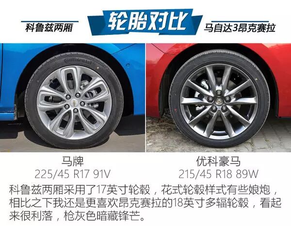 在空间表现方面,从上面的对比可以看出,两款尺寸相近的车型具体表现也相差不远,其中科鲁兹后排地板凸起高度较低,同时在储物空间方面也有更佳的表现;马自达3昂克赛拉则提供了后排空调出风口和更大的后备厢,可以说各有所长。