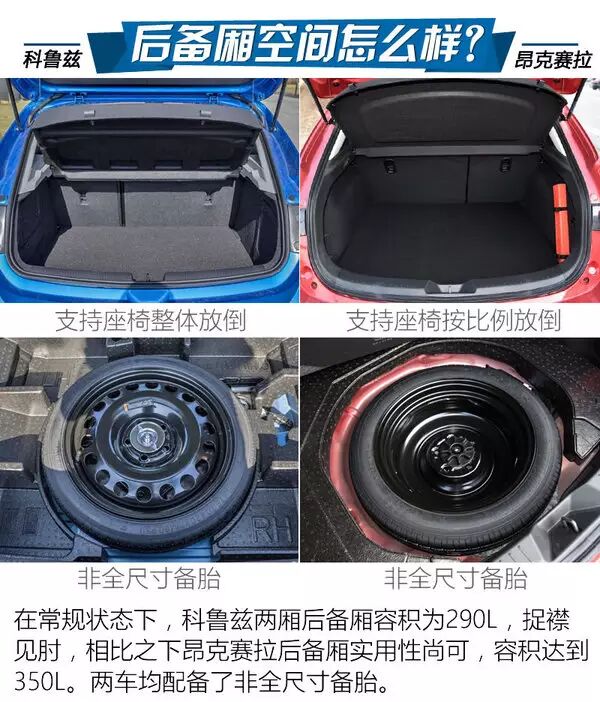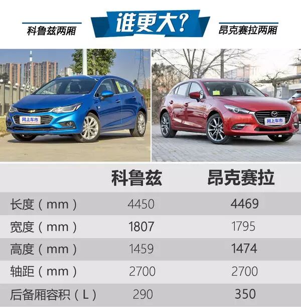 在车身尺寸方面,马自达3昂克赛拉在车身长度和高度部分稍稍占优,而科鲁兹两厢则拥有更宽的车身,两车轴距数据完全相同。后备厢方面两车表现都一般,特别是科鲁兹两厢在常规状态下后备厢容积仅为290L,比较局促,不过两车均支持后排座椅按比例翻折。