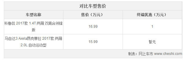 我们今天对比的车型分别是科鲁兹两厢双离合领锋版和2017款马自达3 Axela昂克赛拉两厢 2.0L 自动运动型,它们都是各自车系的最高配车型,终端市场售价分别为16.99万和15.99万元,其中科鲁兹两厢可以享受1万元左右的终端优惠,所以两款车型的最终购买售价基本相同。