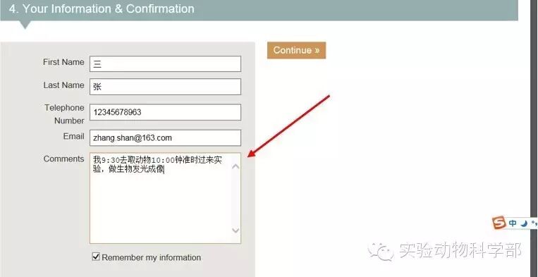步骤四:在Your Information & Confirmation中详细填写预约信息(请中文填写)姓名,电话,邮箱为必填(便于实验变更联系)。Comments内容请说明需要实验的内容。