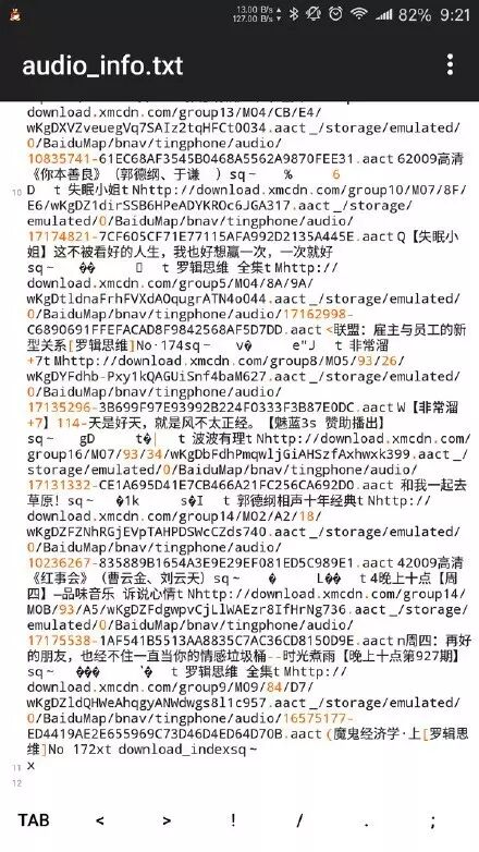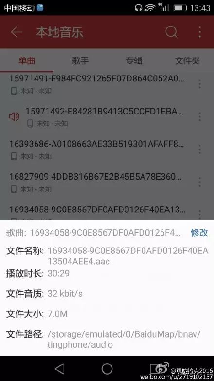 这一问题的发现还得感谢网易云音乐,在检索本地音乐时,网易搜索出7首不具有ID3信息的音频文件,它们的文件名多为似数字和字母的长串组合,这些信息不全的音频文件打开后全是互联网电台节目,其中两段为单田芳、郭德纲的相声节目。本以为这些音频的来源是网易云音乐,没想到仔细查看路径,才发现音频都被存放在/storage/emulated/0/BaiduMap/bnav/tingphone/audio中,该路径正是百度地图的路径,百度的锅差点就让网易背了。