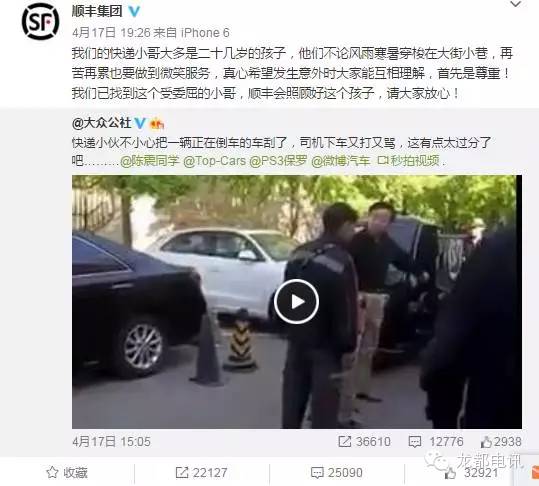 视频内容是,一位顺丰快递员因与轿车车主发生轻微剐蹭被打 6 个耳光!并在快递员向其 道歉 后,车主称“说对不起就完事了”仍然继续打了快递员两个耳光。