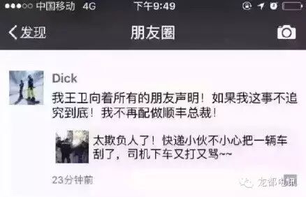 针对视频曝光的内容,顺丰集团总裁王卫朋友圈发文称,“如果这事不追究到底,我不再配做顺丰总裁!”