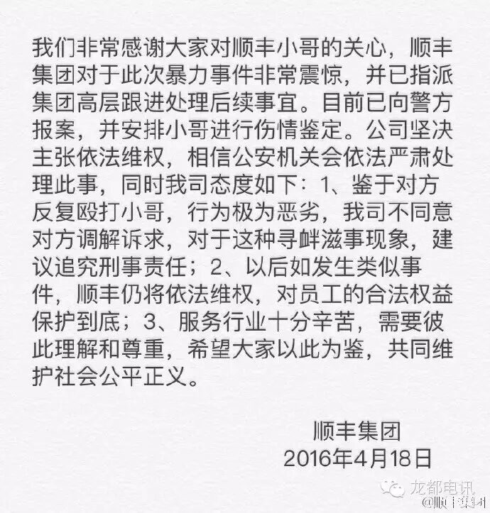 “我们的快递小哥大多是二十几岁的孩子,他们不论风雨寒暑穿梭在大街小巷,再苦再累也要做到微笑服务,真心希望发生意外时大家能互相理解,首先是尊重。我们已找到这个受委屈的小哥,顺丰会照顾好这个孩子,请大家放心。”
