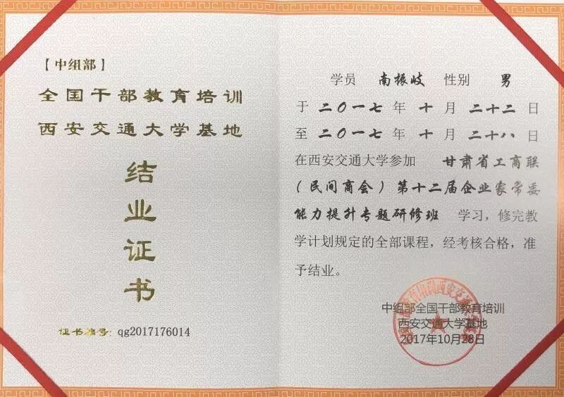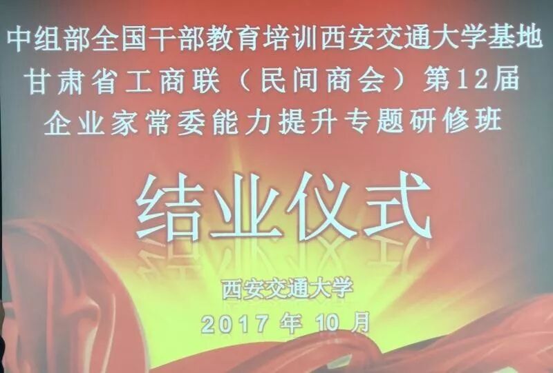 10月27日下午,甘肃省工商联(民间商会)新一届领导班子和领导机构成员能力提升专题研修班在全国干部教育培训西安交通大学基地圆满结束。省工商联(兼职)副主席,企业家执常委及省委统战部、省工商联相关处室干部共50余人参加了研修班。南特数码科技集团董事长、总裁南振岐先生作为甘肃省总商会副会长参加了本次研修班。