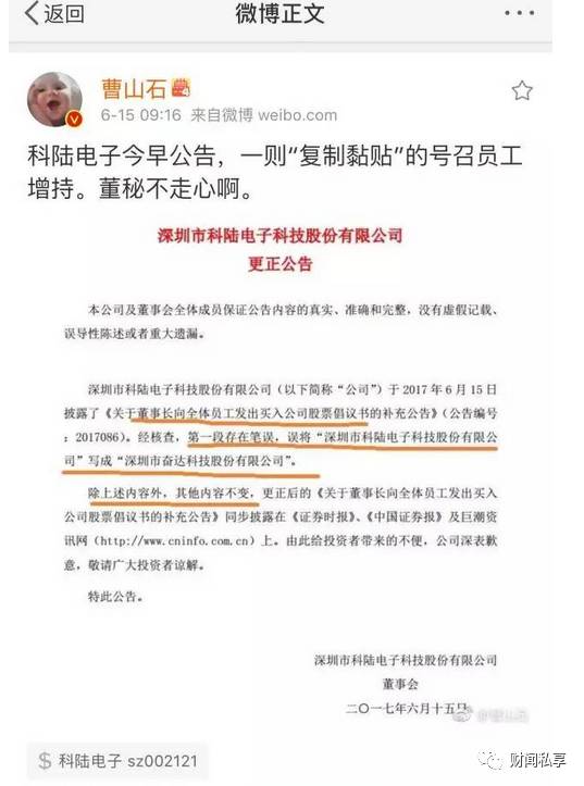 昨日,科陆电子发布“兜底式增持”倡议书的乌龙事情着实让市场消费了一把,因为倡议书把该公司名称“不小心”写成了其他公司,被投资者评论为:董秘“复制粘贴”不走心。虽然公司随后发布更正公告,但这件事也给上市公司敲响了警钟,上市公司在发布公告时一定要谨慎再谨慎,这种乌龙事情不仅对公司的信誉有影响,而且对投资者也是一种不负责任的行为,会直接影响到投资者对公司的信心。