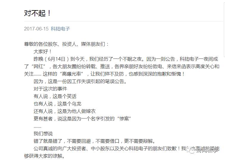 对此,科陆电子15日晚间表示,因为这则公告,科陆电子一夜间成了“网红”,这样的“高曝光率”,让科陆电子猝不及防,也感到深深的抱歉和惭愧。