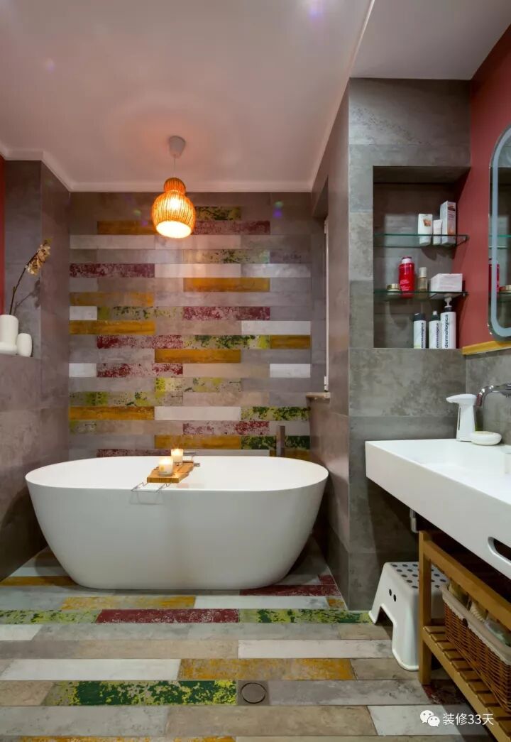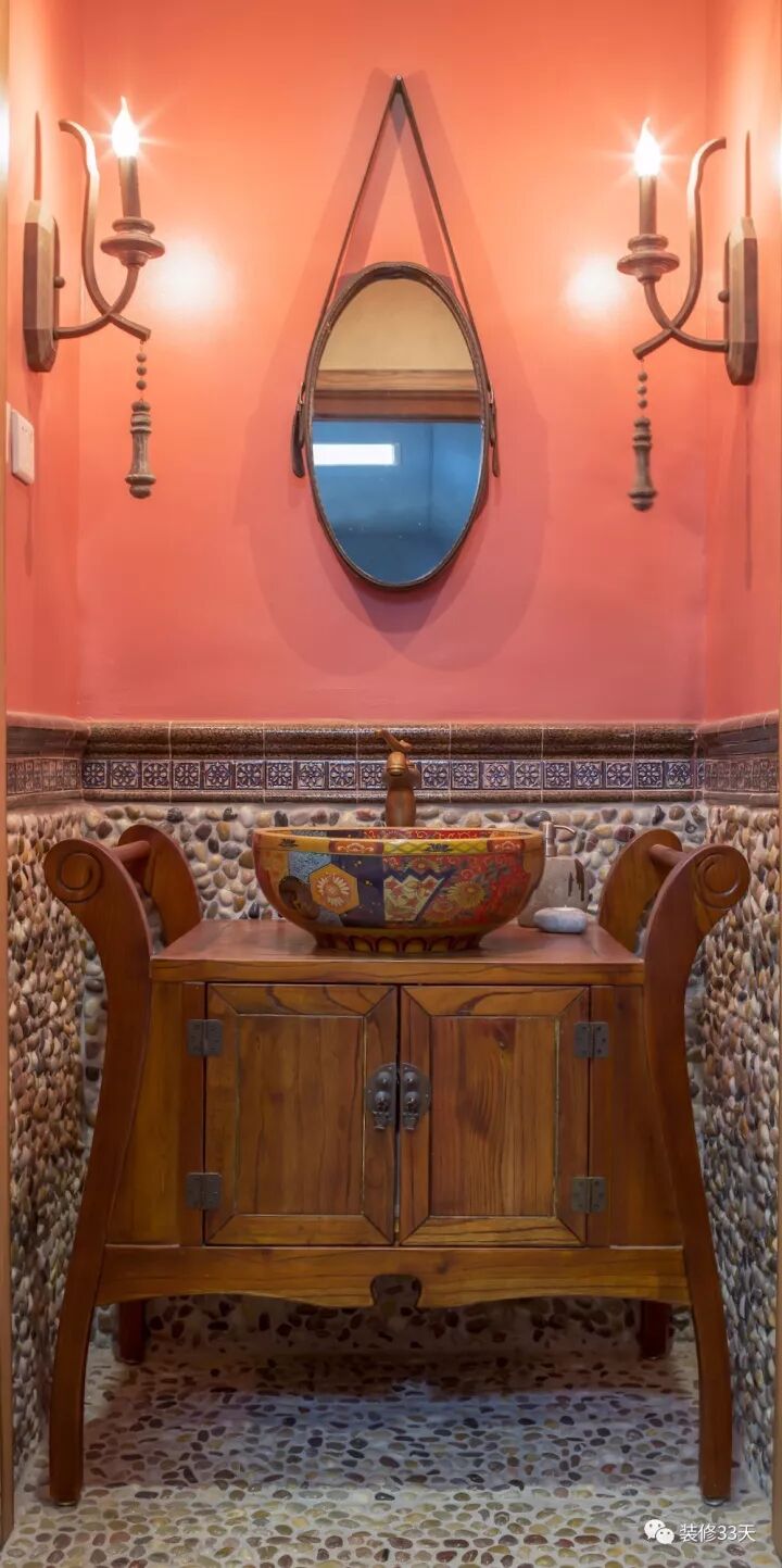 ▲ 卫生间干湿分区,绚丽的鹅卵石与花砖铺贴出墙裙效果,红色防潮涂料与古色古香的台盆柜完美搭配