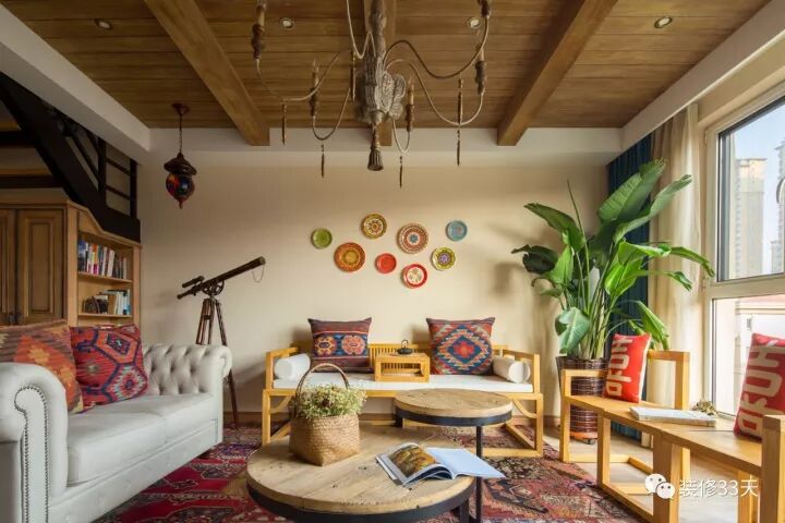 ▲ 顶层带阁楼的格局,建筑面积150平,一层面积90平,阁楼面积60平,总造价65万(软硬装+家具电器),整个客厅散发着浓浓的异域风情,东亚温润木质与北欧的冰雪童话,制造温馨个性的空间