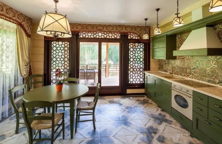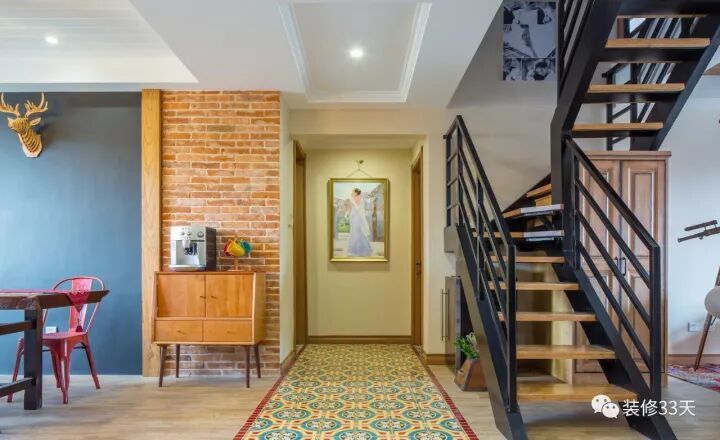 ▲ 客厅与餐厅之间用走廊与楼梯分割区域,花砖铺贴出的走廊地面,给人一种延伸入室内的感觉