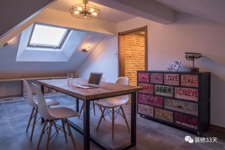 ▲ 二楼的工作室,斜屋顶的玻璃采光窗,让空间充满阳光,铁件实木桌搭配埃姆斯椅,做旧的彩色字母多斗柜,个性又实用
