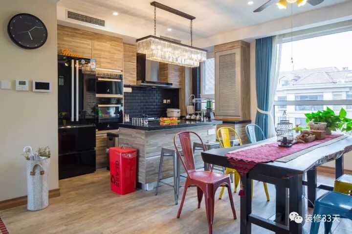 ▲ 餐厅地面延续木色地板,对称的红色文化砖中间夹一面黑板墙,一张实木餐桌椅搭配三原色的铁艺餐椅,用色彩营造活泼的用餐氛围