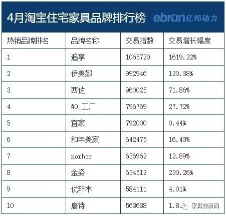2017年4月淘宝住宅家具品牌排行榜中,按照交易指数由高到低,追享以1,065,720的交易指数排名第一,伊美娜、西佐则分别以992,946、960,025的交易指数排名第二、三名。另外,进入榜单的其他品牌还包括:#0 工厂、宜家、和年美家、norhor、金姿、优轩木、唐诗。而在交易增长幅度中,西佐以71.86%的增长幅排名第一。
