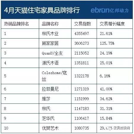 2016年4月淘宝天猫住宅家具品牌排行榜中,按照交易指数由高到低,林氏木业以433,458的交易指数排名第一,全友、风飞扬则分别以206,893、199,865的交易指数排名第二、三名。另外,进入榜单的其他品牌还包括:蔻丝、顾家家居、龙森、和购、百佳惠、林氏、蔓斯菲尔。而在交易增长幅度中,龙森以76.91%的增长幅排名第一。