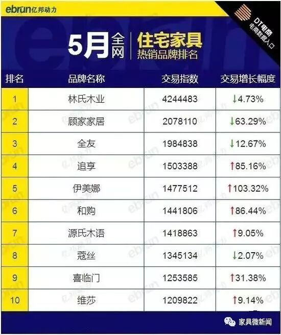5月全网住宅家具热销品牌前十名分别为:林氏木业、顾家家居、全友、追享、伊美娜、和购、源氏木语、蔻丝、喜临门、维莎。