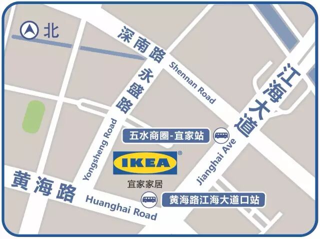 宜家南通商场坐落于五水商圈,地处黄海路与江海大道交界处,占地面积为48000平方米,包含一个露天停车场为顾客提供免费停车位。