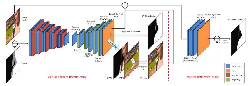而通过了这两阶段的神经网络,前景图像的alpha通道蒙版便随之完成。