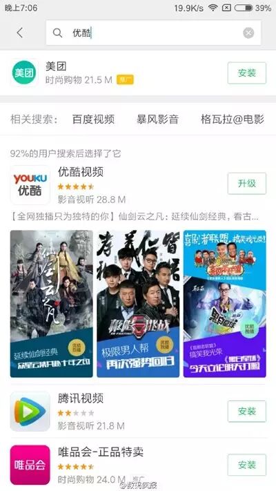 第十三条规定,互联网广告可以以程序化购买广告的方式,通过广告需求方平台、媒介方平台以及广告信息交换平台等所提供的信息整合、数据分析等服务进行有针对性地发布。在MIUI8商店中搜索优酷,出来的广告显示的却是与优酷类别无关的美团,无法体现大数据时代广告的针对性和精确性。