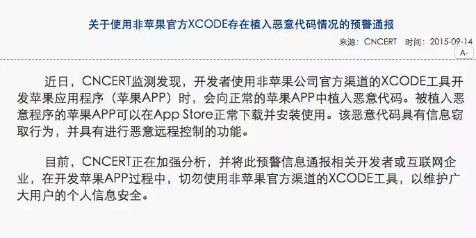 起因正是不少开发者使用了非官方渠道的XCode开发工具,且工具中注入了名为XcodeGhost的恶意软件。使用了非官方XCode开发出的合法应用,绕过了苹果引以为豪的严格审查,进入了App Store。这件事的发生并不意味着iOS的系统安全性有问题,而是苹果公司自己在审查环节存在疏漏,用户本身对此也无能为力。